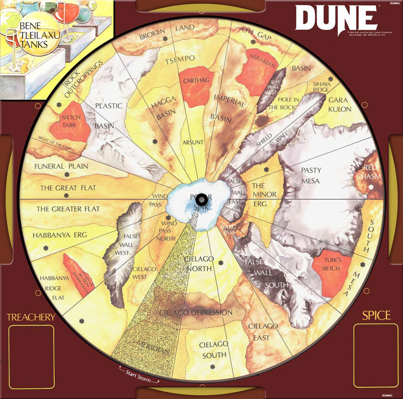 The main board disc is essentially complete. Since I had graphics for all of the board spaces, it was a no brainer to put together the Spice Deck. The original version has the region completely isolated. I decided to highlight the space where the spice blow occurs and desaturating the spaces around it, so you could see where it was contextually.