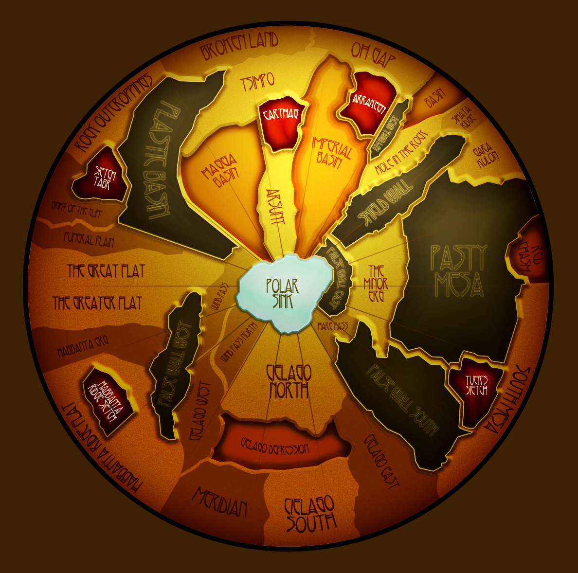 I have made some progress on my custom version of Dune. I’ve got quite a bit of the board artwork done. I hadn’t decided on a particular style at first, but I knew I needed to at least have all the board spaces drawn out. So I re-drew all of the locations from the original board. As I did so, I started playing with textures, colors and effects. I went with more abstract outlines for the regions, more like something you’d see on a Risk board. My goal was to differentiate the types of regions and still maintain the desert planet look.